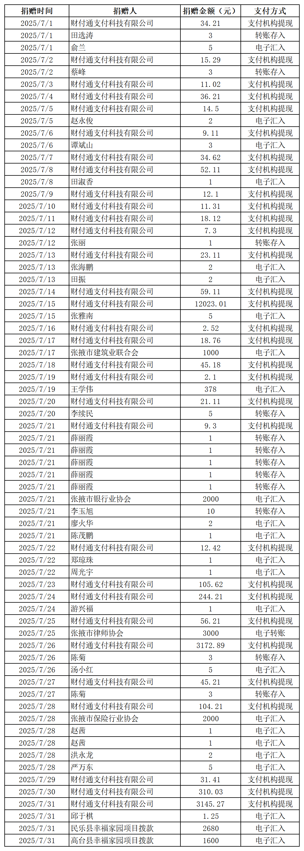 2025年張掖市慈善協(xié)會積極搭建愛心平臺,得到廣大愛心人士和愛心單位積極響應,踴躍捐款捐物,現(xiàn)將(2025年7月1日--7月31日)接收到的銀行轉賬收入公示如下: